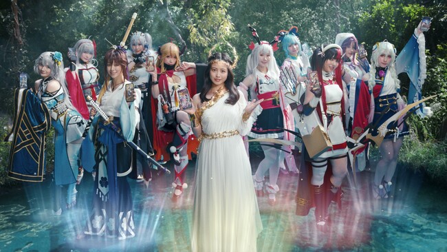 今回のCM撮影に伴って行われたキービジュアルの撮影。透き通った泉の中にいる女神・今田美桜さんの周りには放置少女のキャラクターが映し出されたスマートフォンがたくさん落ちて来ています。今田さんが人気俳優としての美貌と表現力で魅せた表情は見る者の目を奪いますね!