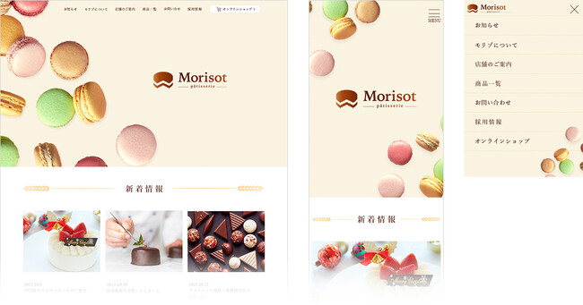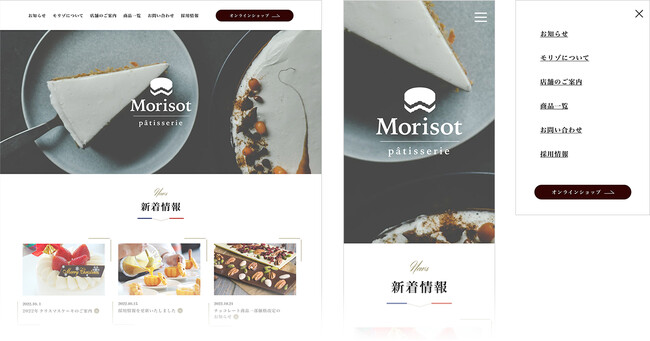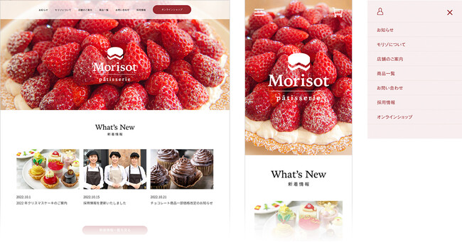 PC版、スマホ版、どちらもすっきり上品にまとまっていますね。適切な余白により、ロゴも小さめながら印象的です。カットしたホールケーキか、マカロンのように見えるロゴマークが、このキービジュアルの効果でマカロンに見えますね。