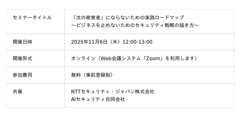NTTセキュリティ・ジャパン株式会社(本社:東京都千代田区、代表取締役社長:関根 太郎)は、2025年11月6日(木)にAIセキュリティ合同会社(本社:東京都新宿区、代表取締役:堀居 隆生)と、「『次の被害者』にならないための実践ロードマップ~ビジネスを止めないためのセキュリティ戦略の描き方~」セミナーを共同開催します。