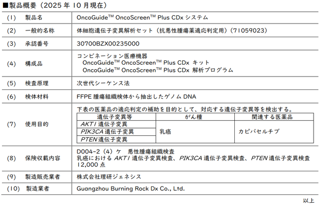 株式会社理研ジェネシス(本社:東京都品川区、代表取締役社長:大井 優子)は、2025年9月19日に国内で製造販売承認された、「OncoGuideTM OncoScreenTM Plus CDxシステム」において、「トルカプ(R)錠160mg/トルカプ(R)錠200mg」(一般名:カピバセルチブ)とフェソロデックス(R)(一般名:フルベストラント)(製造販売元:アストラゼネカ株式会社、本社:大阪市、代表取締役社長:堀井 貴史)との併用療法の適応となる、内分泌療法後に増悪したPIK3CA、AKT1またはPTEN遺伝子変異を有するホルモン受容体(HR)陽性かつHER2陰性の手術切除不能又は再発乳癌に対するコンパニオン診断※1として2025年10月22日付で新たに保険適用されましたことをお知らせいたします。本検査の臨床導入により、乳癌患者さん一人ひとりにいち早く検査結果をお届けし、治療選択に貢献できるよう、検査体制の強化に取り組んでまいります。