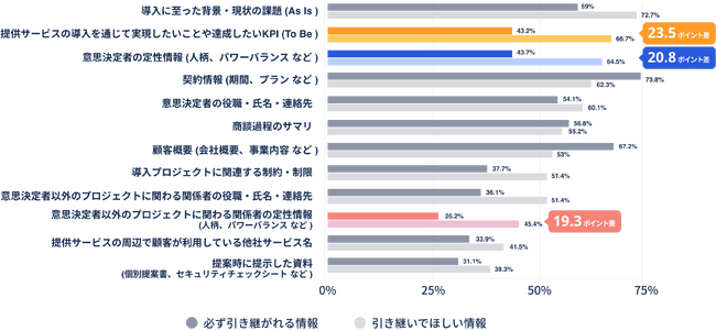 カスタマーサクセスが引き継いでほしい情報と営業から必ず引き継がれる情報についても調査しました。差分が大きい上位3項目は、「提供サービスの導入を通じて実現したいことや達成したいKPI」が23.5ポイント、「意思決定者の定性情報」が20.8ポイント、「意思決定者以外のプロジェクトに関わる関係者の定性情報」が19.3ポイントとなりました。