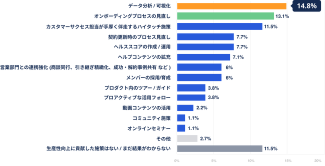 一方で、この1年間でCS組織の生産性向上に一番寄与した施策については、データ分析/可視化が14.8%でトップとなりました。データ分析/可視化によりフォローすべき顧客の優先順位/見極めを行ったり、施策の成果を振り返りアクションの精査を行うことで、生産性向上に繋げたチームが多いのではないでしょうか。