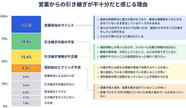 引き継ぎが不十分だと感じる方に理由を尋ねたところ、「営業担当のマインド」と「引き継ぎ内容の不足」が共に18.8%とトップになりました。引き継がれる“情報”だけでななく、受注後のプロセスへの営業の理解が重要な要素となっていることがわかりました。