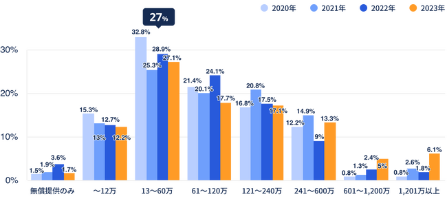 ACV13~60万円(MRR1~5万円)の価格帯が27.1%となっています。2022年は全体的に低めの価格帯に移行していましたが、2023年はACV241万円(MRR20万円)以上の割合が増加していることがわかります。
