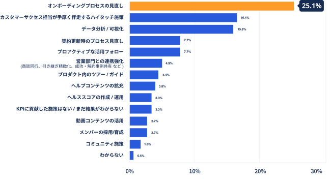この1年間で、最も優先度の高いKPIに寄与した施策については、昨年に引き続きオンボーディングプロセスの見直しが25.1%と多数を占めました。