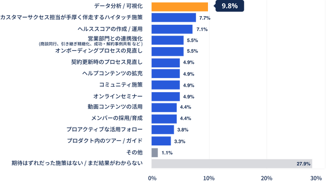 KPI改善のために行った最も期待外れだった施策については、データ分析/可視化が9.8%とトップでした。