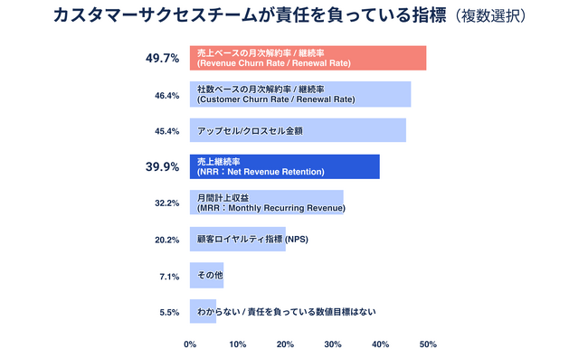 カスタマーサクセスが負っている指標について聞いたところ、「売上ベースの解約率」を指標としているチームがトップとなりました。2020年から3年連続でトップとなっていた「社数ベースの解約率」は次点となっています。