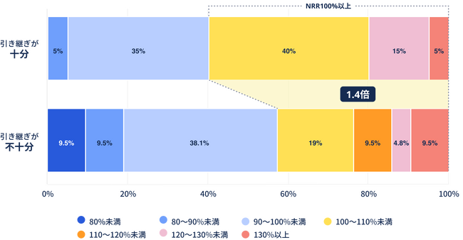 さらに売上維持率(NRR)についても見てみると、引き継ぎが十分に行われている企業では100以上が60%と、引き継ぎが不十分は企業の1.4倍となっています。顧客の状況を正しく引き継ぐことで、解約防止のみならずエクスパンション創出にもつなげられることが明らかになっています。