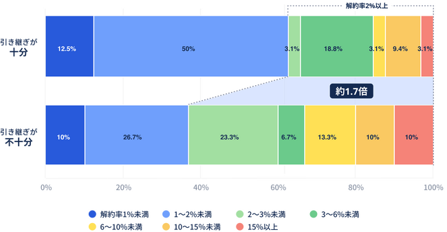 引き継ぎが不十分な企業の63.3%が、解約率が2%以上となっており、引き継ぎが十分な企業の1.7倍となっていることがわかりました。また引き継ぎが不十分な企業では解約率が15%以上の企業が10%と、引き継ぎ不足は大きな事業リスクに繋がることがわかりました。