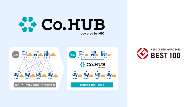 MIC株式会社(所在地:東京都新宿区、代表取締役会長 水上光啓、代表取締役社長 河合克也、東証スタンダード上場証券コード300A、以下「当社」)は、小売店とメーカーを対象とした販促物の共同配送サービス「Co.HUB」において、このたび2025年度グッドデザイン・ベスト100(主催︓公益財団法人日本デザイン振興会)を受賞いたしました。