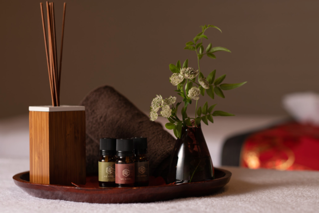 スパの文化自体が海外発祥ということもあり、アロマオイルなどのスパ用プロダクトは、ほとんど日本で作られていません。そのため、一般的なスパではヨーロッパやアジアなどの海外製品を使い、トリートメントの手法も西洋式ですが、当社は「日本のスパなのだから、日本の製品を使って、日本の技術、そして日本のおもてなしの心を提供したい」と考え、『庵SPA』のサービスを確立しました。今治タオルや信楽焼の茶器ほか、小物類にも日本の上質な伝統工芸をちりばめ、セラピストの制服も着物をイメージしたものにするなど、徹底して「純日本」を追求していることが特長です。