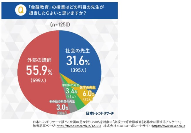 また、大手リサーチ会社の調査によると、高校での金融教育の授業導入については「賛成」が大多数だったものの、誰が教えたら良いかという質問には、半数以上の方が学校の教師ではなく外部の講師が良いと答えている。
