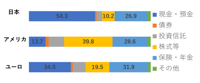 日本人の個人金融資産の内訳を見ると、半分以上の資産を現預金の形で保有している。現在日本の個人金融資産は約2000兆円と言われているので、約1000兆円超が現預金ということになる。低金利時代で預金してもほとんど利息が付かず、またインフレが進み、資産としての価値が目減りしているのにも関わらずこの現状である。 ※図表は金融資産合計に占める割合(%)