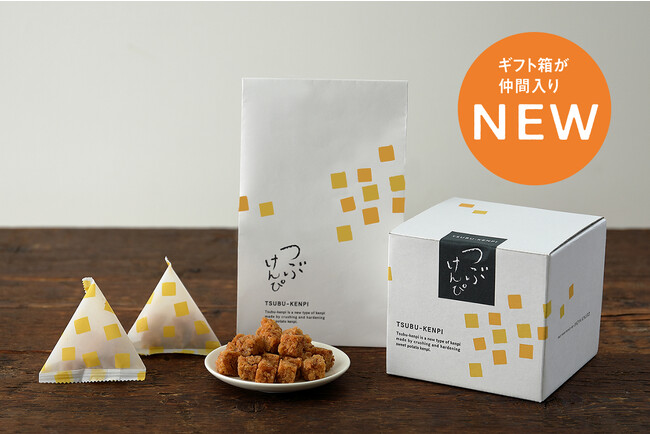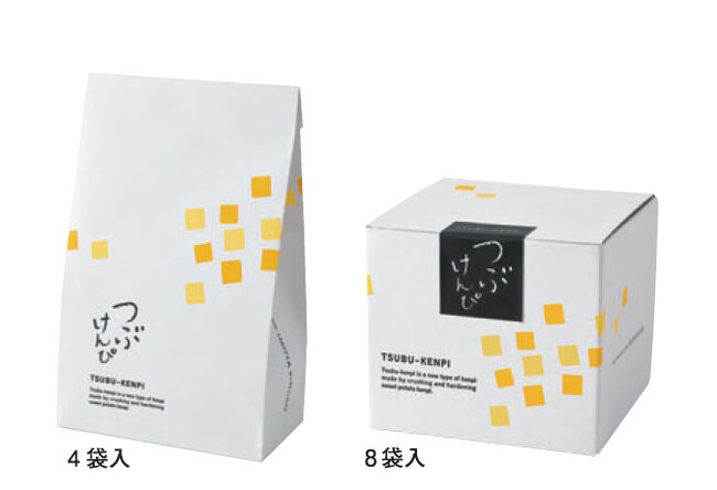 芋けんぴの原料であるコガネセンガンをあますことなく大切に使いたいという思いから、新しい芋けんぴが誕生しました。その名も「つぶけんぴ」。今年6月の発売以降、「芋けんぴの新しいおいしさ」と大好評!!個包装をかわいいテトラパックにリニューアルして新たに化粧箱も仲間入り。