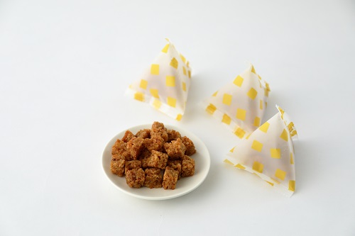 つぶけんぴは、芋けんぴの製造段階でどうしても折れたり、欠けたりしてしまう素揚げの芋けんぴを砕き、プルラン(※)という植物由来の糊料でひとくちサイズにころんと固め、オーブンで焼き上げた金次郎オリジナルのお菓子。カリッとほどよい食感と、今までにない口ほどけのよさをお楽しみいただけます。