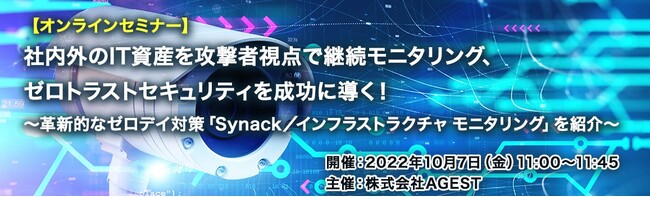 Mapion > ニュース > リリース > AGEST、10月7日(金)にオンラインセミナー「ゼロデイ対策を実現するインフラストラクチャ モニタリングソリューションとは?」を開催