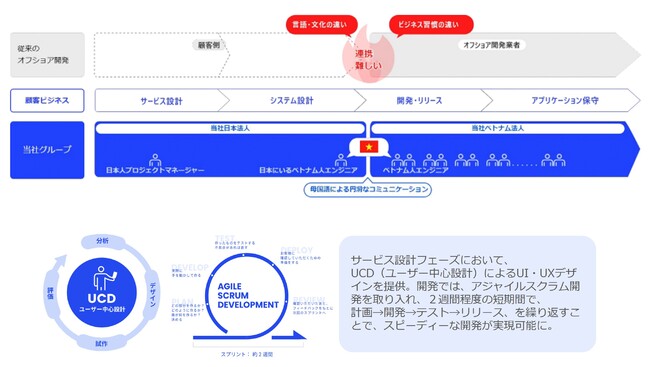 当社の提供するサービスは、日本とベトナムのリソースを融合させ、顧客のビジネスとテクノロジーという両側面からDXを推進する「ハイブリッド型サービス」です。ハイブリッド型サービスにおいては、コミュニケ―ションの仲立ち役である、日本人PMとベトナム人PMの豊富な経験から、従来のオフショアでありがちなコミュニケーションの齟齬などを防ぎます。実際のサービス設計フェーズにおいては、UCD(実際にサービスを利用するユーザーの使い方を元にデザイン・インターフェイスを作成)によるUI・UXデザインを提供し、実装のフェーズではアジャイルスクラム開発を取り入れ、計画、開発、テスト、リリースを繰り返すことにより、高品質かつスピーディな開発を実現します。このように、サービス設計からエンハンスまでワンストップでサービスを提供することで、クライアントへ貢献いたします。