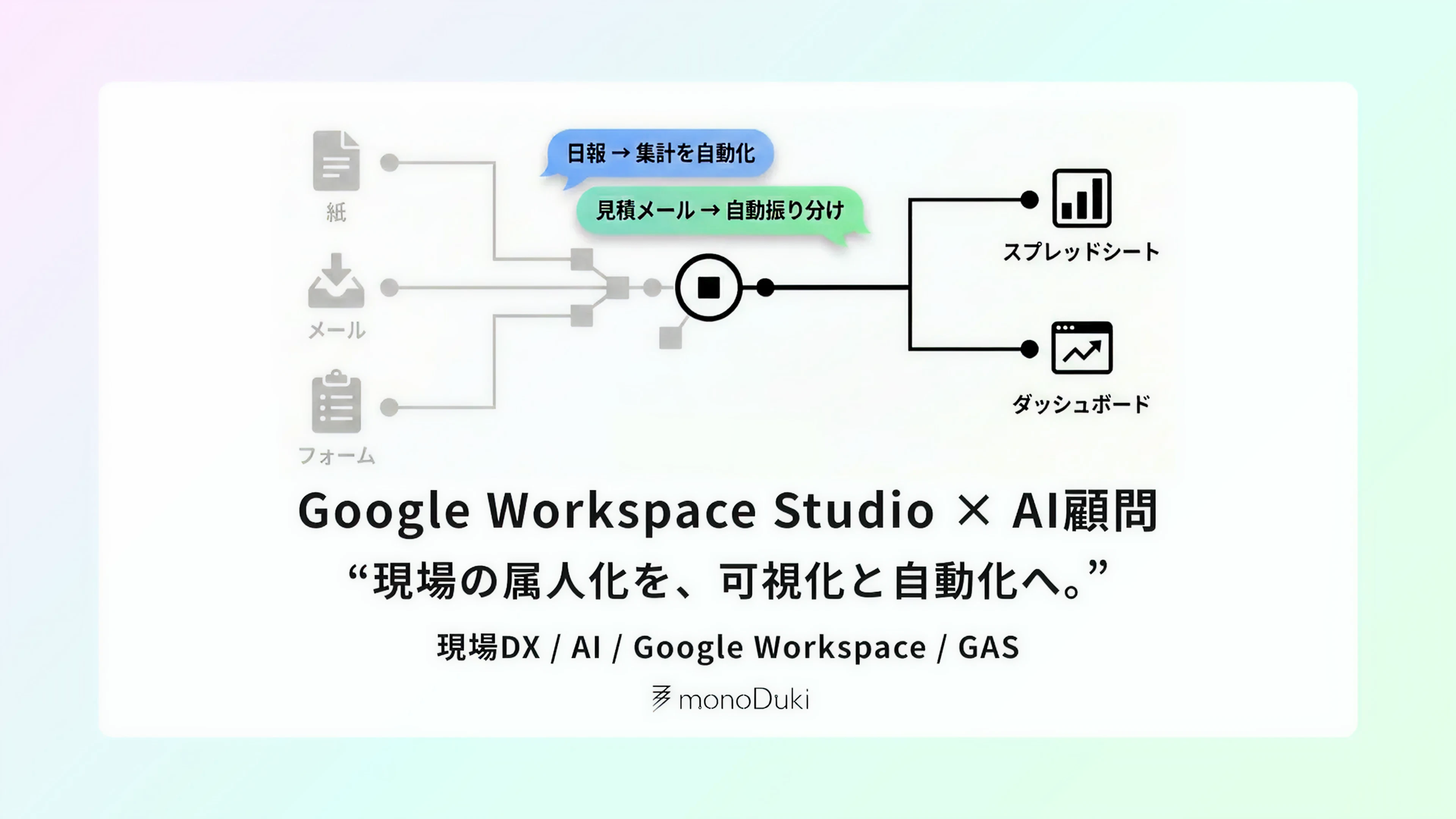 monoDuki合同会社(本社:鹿児島県鹿児島市、代表:村上 将太郎、以下「monoDuki」)は、Google LLC が一般提供を開始した新プラットフォーム 「Google Workspace Studio」(旧称:Google Workspace Flows) に対応し、Google Workspaceを活用した伴走型DX推進サービス 「現場の相棒AI顧問 for Google Workspace」 の提供を開始しました。