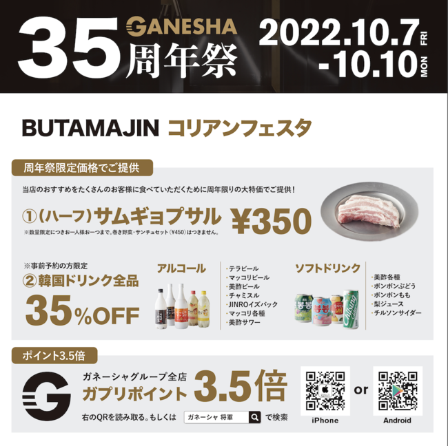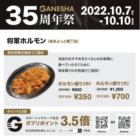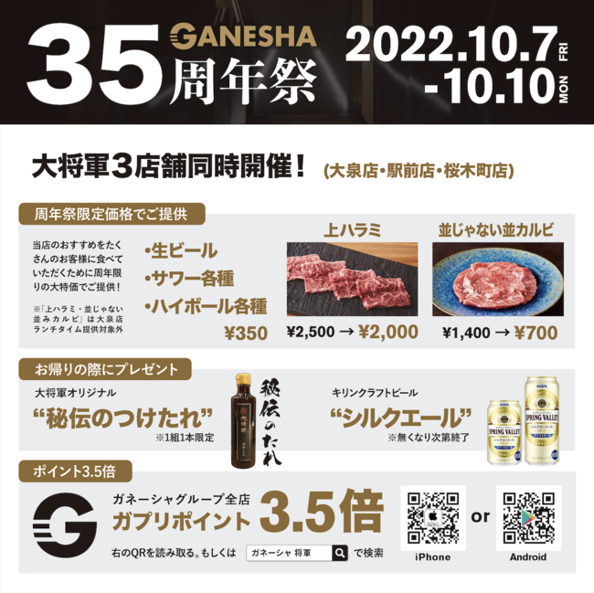富山の老舗焼肉店「焼肉ハウス大将軍」率いる株式会社ガネーシャが創立35周年!感謝の気持ちを込めて全店舗で周年祭を開催!