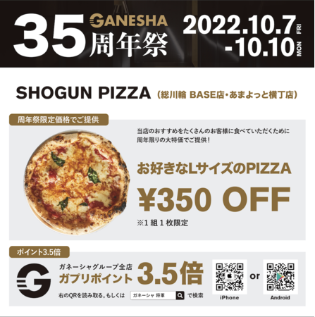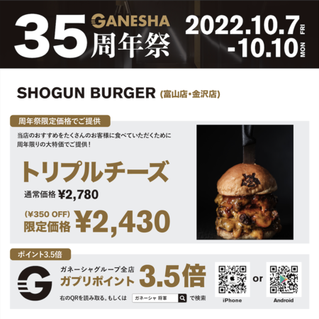 「株式会社 ガネーシャ」 本社:富山県富山市、代表取締役:本田大輝は、10/7-10/10 の4日間、この度創業35周年を迎えられた感謝をみなさまにお伝えするべく全店舗にて周年祭を開催します。【URL】https://ganesha-inc.net