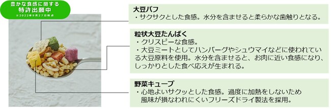 現在、穀類や種実、及びドライフルーツで出来たシリアルは様々なブランドの商品が販売されておりましたが、いずれも均一に近い食感となっていることに気付きました。そこで、大豆と野菜の素材本来のおいしさを大切にしながら、”サクサク”や”カリカリ”など複数の食感を出すために、野菜原料の組み合わせや素材の加工方法を試行錯誤しました。※本発明は特許出願中となります。(9月27日時点)
