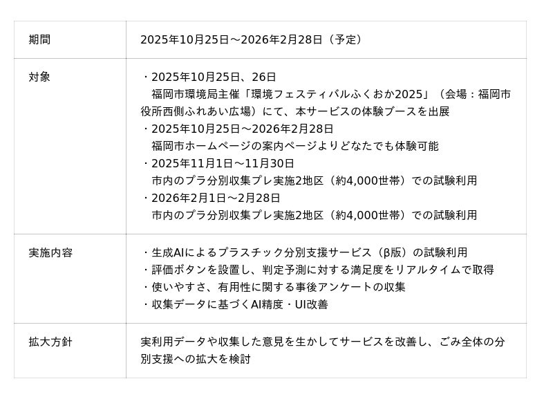 LINEヤフーコミュニケーションズ株式会社(本社:福岡市博多区、以下 当社)は、福岡市との公民共働事業として、同市で2027年2月より開始予定のプラスチック分別収集に先立ち、福岡市LINE公式アカウント上で利用できる生成AIによるプラスチック分別支援サービスのβ版を開発し、2025年10月25日から実証実験を開始します。分別したい物を撮影または名称入力すると、プラスチック分別ができるか・できないかのAI判定予測を即時提示するサービスです。