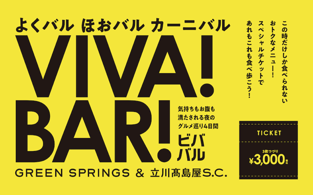 (株)立飛ストラテジーラボ(本社:東京都立川市/代表取締役:村山正道)が運営する複合施設GREEN SPRINGSにて、バル企画参加店舗を巡り、チケット制で食べ・飲み歩きを楽しむイベント「VIVA!BAR!(ビバ!バル!)」を、10月24日 (月)~10月27日 (木)に開催します。今回は立川高島屋S.C.とタイアップし、同施設の一部飲食店も参加します。