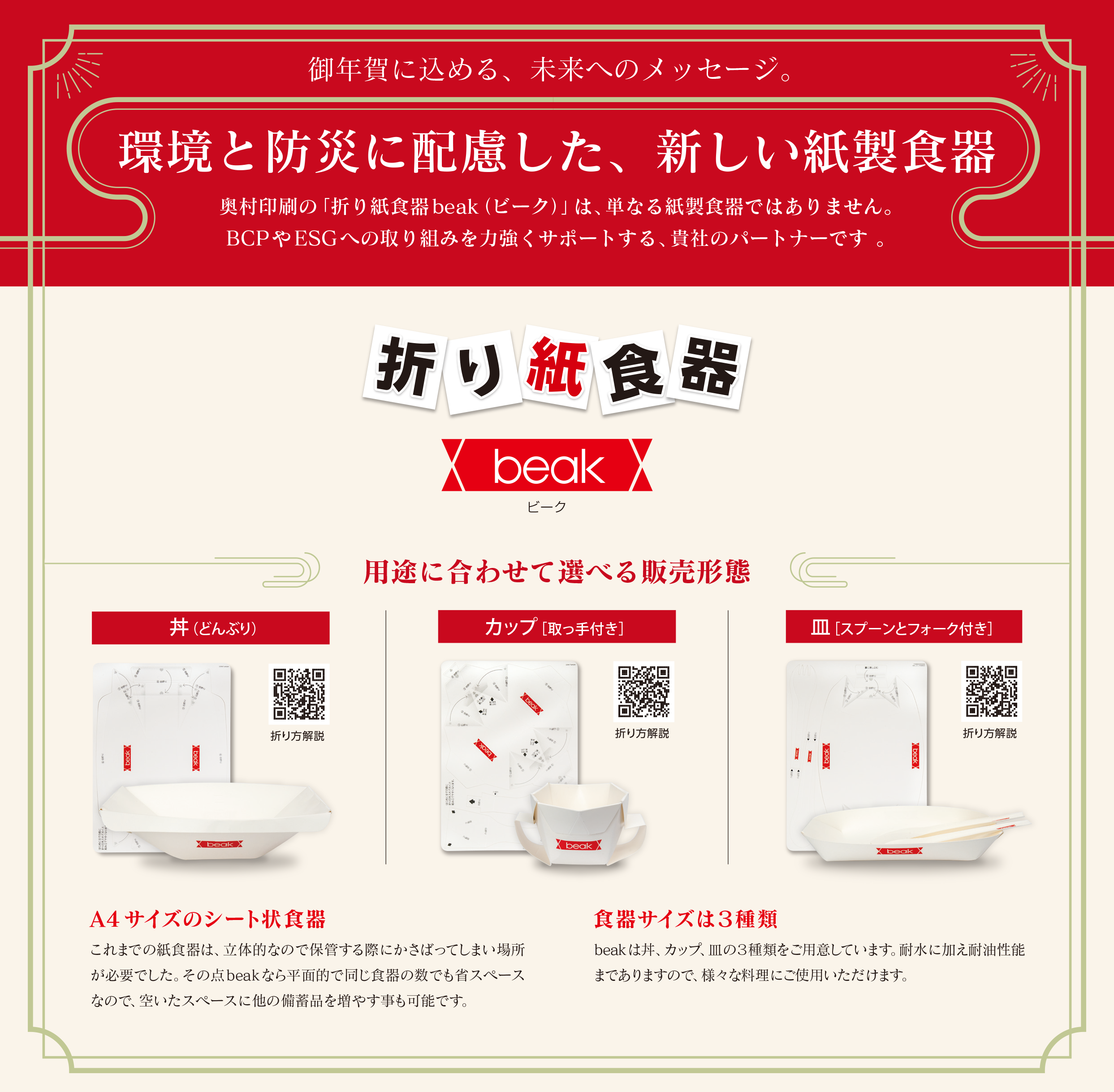 奥村印刷株式会社(本社:東京都北区、代表取締役社長:奥村文泰)は、企業の年始の挨拶回りで使用するお年賀商品として、環境と防災に配慮した新しい紙製食器「折り紙食器 beak(ビーク) 」の法人向け販売を本格的に開始しました。単なる新年の挨拶ではなく、「BCP(事業継続計画)」と「ESG(環境・社会・ガバナンス)経営」への取り組みを力強くサポートするメッセージ を込めることができるのが特長です。