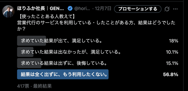 Xで収益したアンケート結果です。皆さん営業を外注しているが、上手くいかないことが多いようです。【調査概要】 ・調査主体:自社調べ ・調査実施時期:2025年12月 ・調査対象者:日本在住の25歳~54歳の男女 ・調査方法:X(旧Twitter)を通じたアンケート調査