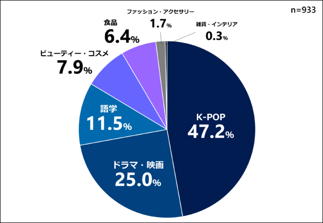 また、K-POPや韓国ドラマ・映画だけにとどまらず、「語学」や「ビューティー・コスメ」「食品」などに一番興味を持っている層も25%と、韓国への関心の幅が広がっていることが分かります。