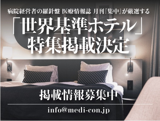 読者の90%が病院経営者または医師である医療情報誌 月刊『集中』は、毎年11月号(10月末発行)にてラグジュアリーホテル特集「Premium Stay」の掲載を予定しています。