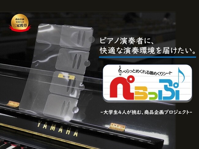 法政大学経営学部4年、西川英彦ゼミナール所属、チームpH。「ピアノ演奏者に快適な演奏環境を届けること」をモットーに 齊藤響/平田愛果/深山征秀/桝田梨央 の4名で活動している。昨年行われた商品企画の全国大会「Sカレ2021」においてピアノ演奏者の楽譜めくりをサポートするアイテム「ぺらっぷ」を提案し優勝。学生賞と日本マーケティング学会賞と合わせて3冠を獲得した。