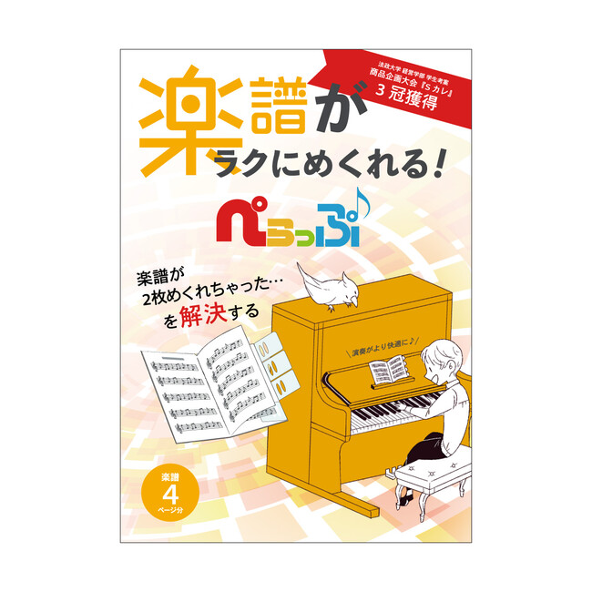 「ぺらっぷ」は、“楽器を演奏しながら楽譜をめくるのは難しい”と感じる楽器経験者メンバーをはじめ、数々のピアノ経験者が抱える譜めくりの難しさに着眼し、もっと楽譜を簡単にめくるためのサポート商品が作れないかと考え、開発されました。