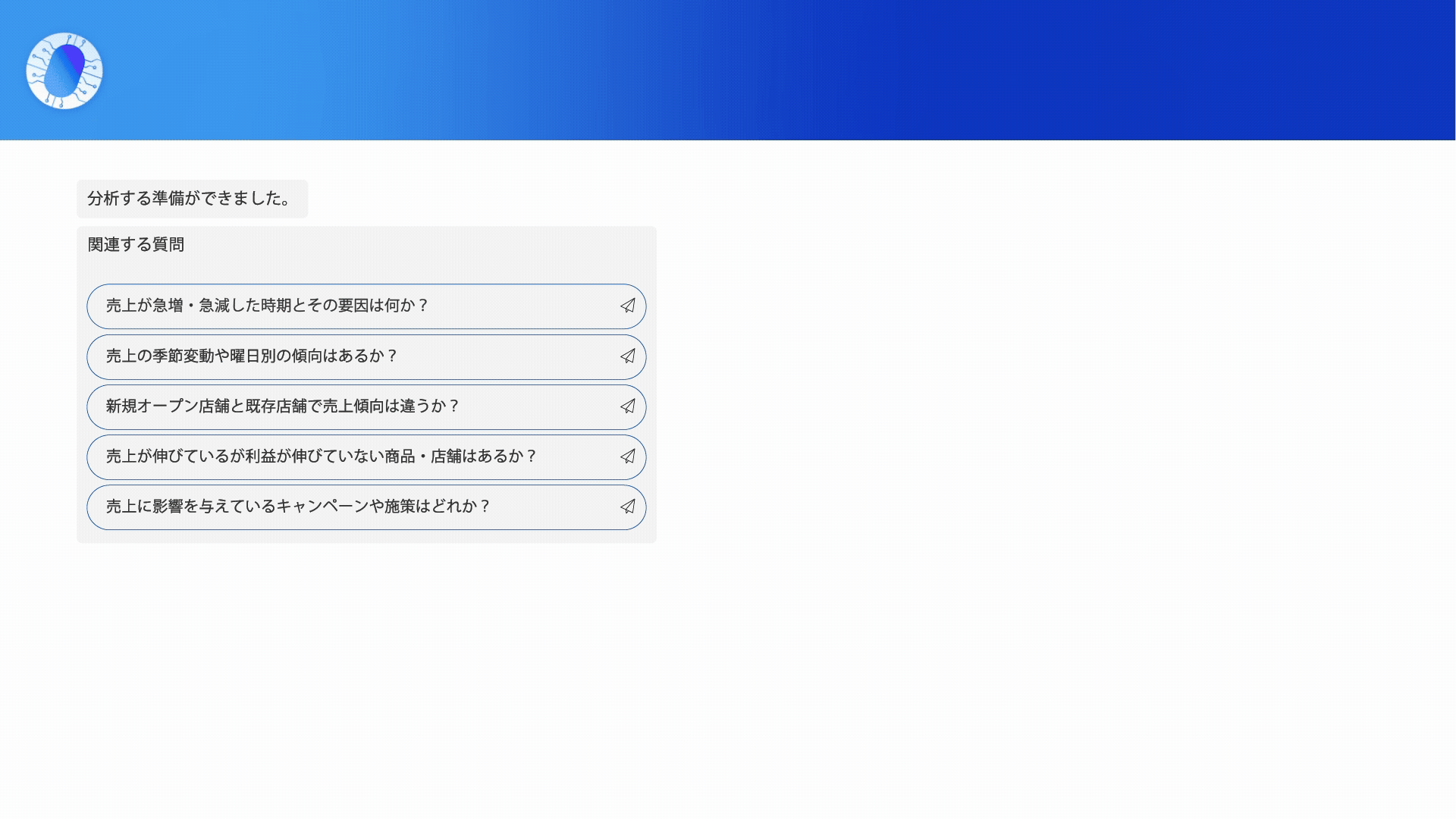 予実の乖離や急増急減の要因特定、利益とのギャップ把握などを対話で自動分析。「売上が伸びているのに利益が出ていない商品は?」「曜日別の売上傾向は?」といった問いに対し、根拠となるデータとグラフ付きで即答します。複雑なデータから、売上のボトルネックと打ち手を同時に明らかにします。