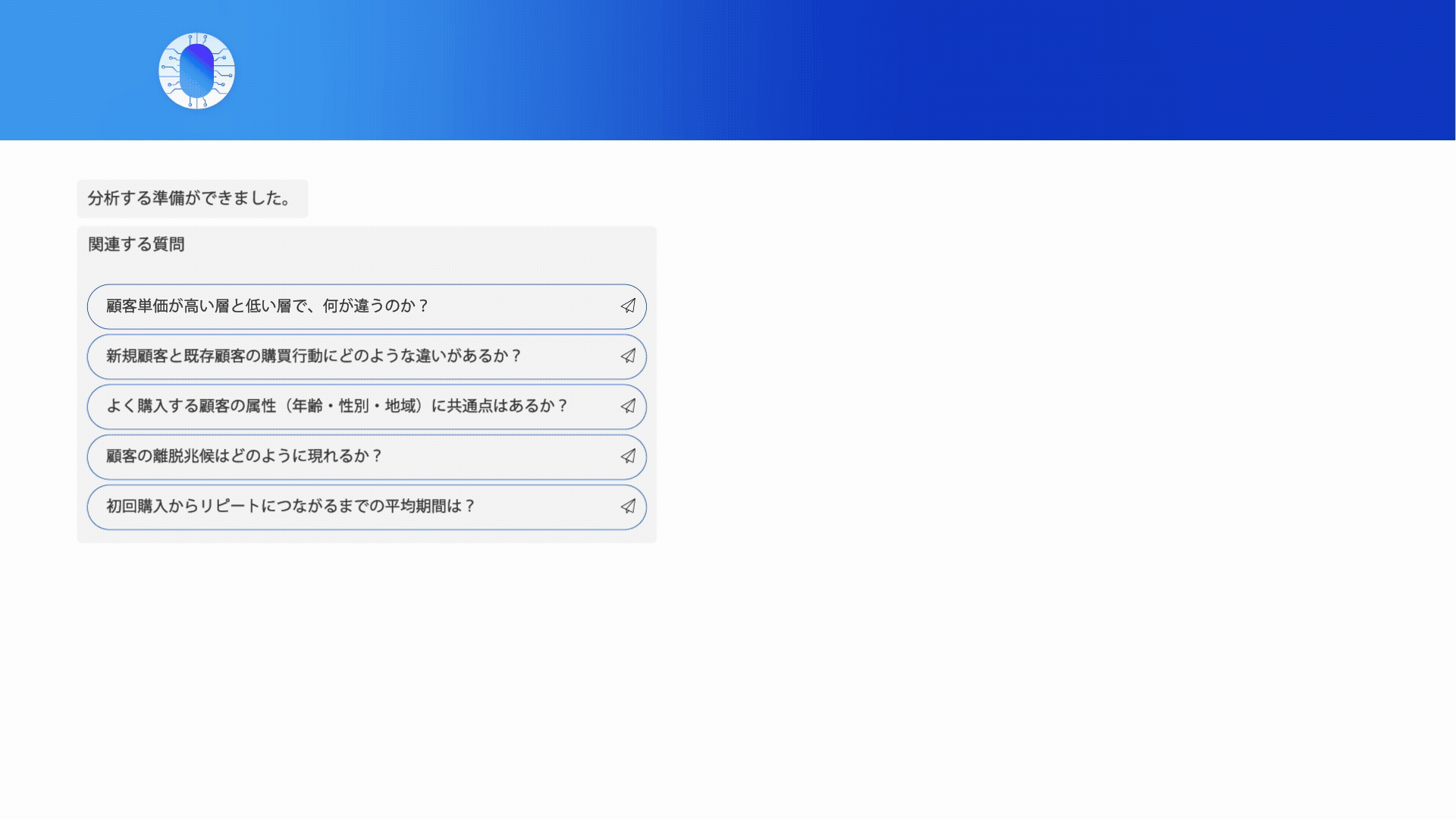 購買履歴や属性データをもとに、新規と既存顧客の行動差やリピート傾向、離脱兆候までを自然言語で探索。「単価が高い顧客に共通する特徴は?」「初回購入から再購入までの平均期間は?」などの問いに、わかりやすい図と洞察コメントで回答します。