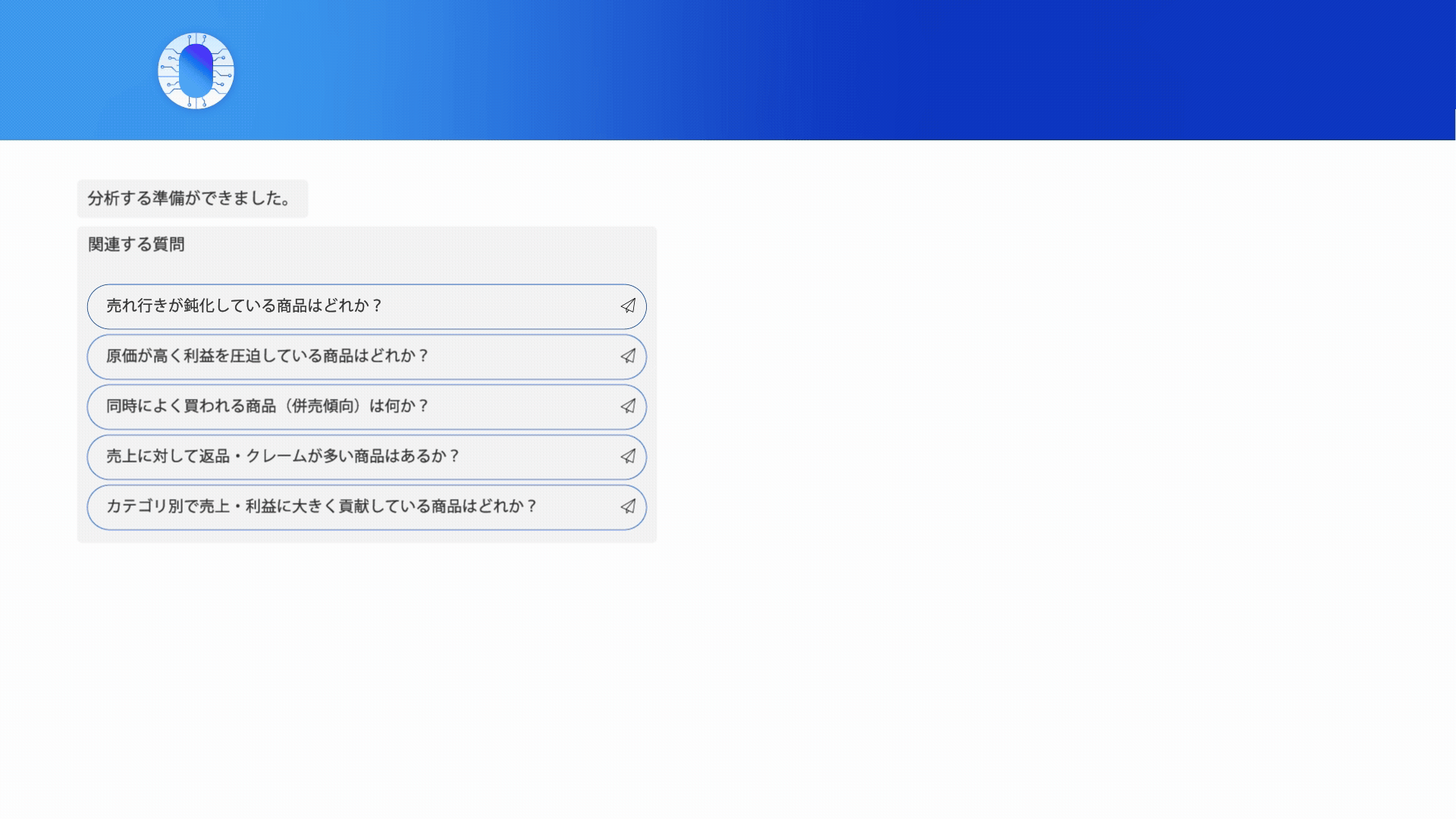 売れ筋や原価圧迫商品など、商品ごとの収益構造や併売傾向も自動で可視化。「原価が高くて利益を圧迫している商品は?」「返品率が高い商品はどれか?」などと質問すると、過去の傾向とともに、改善余地を提示します。