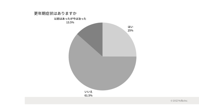 更年期症状があると回答した人は25%、過去にあったと回答した人は13.5%でした。