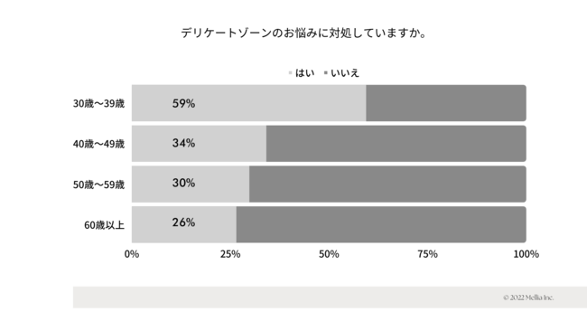 年代別に見ると、年代が上がる毎にデリケートゾーンケアに対するお悩みを感じている割合、またデリケートゾーンケアの実施割合が共に低下していることが分かりました。