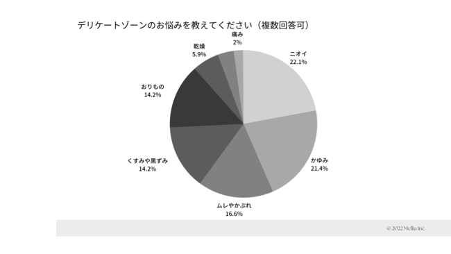 デリケートゾーンにお悩みがあると回答した人のうち、22.1%は「ニオイ」、21.4%は「かゆみ」、16.6%は「ムレやかぶれ」、14.2%は「くすみや黒ずみ」をあげました。