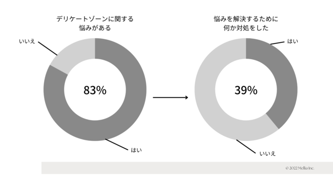 「デリケートゾーンにトラブルを感じている」と回答した人は83%でした。デリケートゾーンにトラブルを実感している人のうち、「トラブルを解消するために、何かしらの対処をした」と回答した人は39%でした。35%の人は20代以下からデリケートゾーンにトラブルを感じていると回答しました。