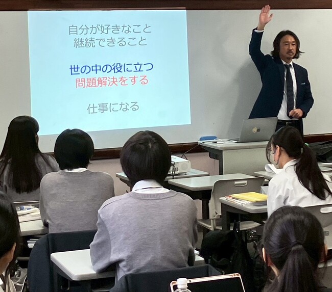 山口が同校で特別授業を行うのは4年連続4度目であり、今年は「グローバルスタディコース」の2年生を対象に実施。グローバル志向の強い生徒たちを対象に、将来の自由な生き方に役立つ知識を届けました。