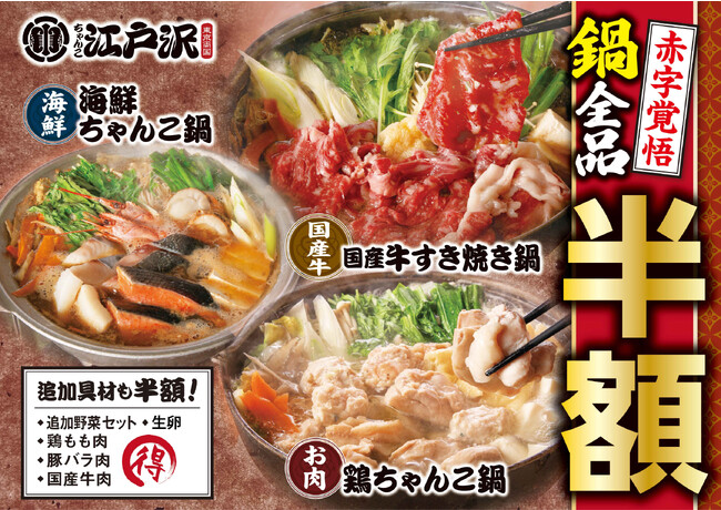 日本の優れた食文化として素材ひとつひとつにこだわり、伝統の味をご提供する「ちゃんこ江戸沢」が10 月、全店にて1 日限りの鍋メニュー全品、半額セールを実施いたします。それぞれ基本12 品目の具材(※)に国産牛肩ロースを加えた「国産牛すき焼き鍋」、鶏つみれ・鶏もも肉を加えた「鶏ちゃんこ鍋」、鶏つみれ・ホタテ・イカ・鮭・白身魚を加えた海の幸たっぷりの「海鮮ちゃんこ鍋」の3 種です。また、「ちゃんこ鍋」では鍋本来のスープ炊きにこだわり、深みがあり、旨味の強い老鶏(ひねどり)からスープを炊き出しています。その味付けは、鶏がらスープの旨味と香りが感じられるように、独自の割合で配合した自慢の醤油味をはじめ、味噌味・塩味の3 つのスープをご用意いたしました。地域のお客様ならびに、日頃よりご愛顧を頂いているお客様へ感謝の気持ちを込めた「秋の大感謝祭」どうぞ皆さまのご来店をお待ちしております。