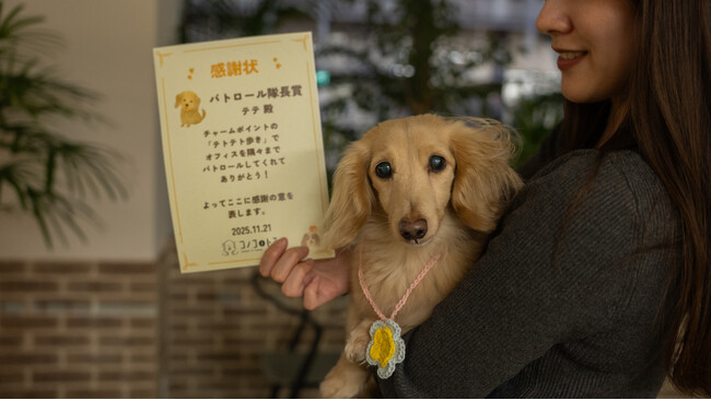 人間の食品と同レベルの国内工場で製造しているドッグフードやサプリメントなどを取り扱う『コノコトトモニ』( https://konokototomoni.com/ )を運営する株式会社ゆずず(本社所在地:福岡県福岡市、代表取締役:中島由華)は2025年11月21日(金)、自社オフィスにて「広報犬の表彰式(ありがとう式)」を開催いたしました。 11月22日の「ペットたちに感謝する日」、23日の「勤労感謝の日」、25日の「いいえがおの日」にちなみ、日々社員と一緒に出社しお仕事に励みながら癒やしと笑顔を届けてくれる“広報犬”たちへ、いつもありがとうの気持ちを込めてオリジナルの賞状と特製メダル・賞品(おやつ・トリーツ缶)を贈呈しました。