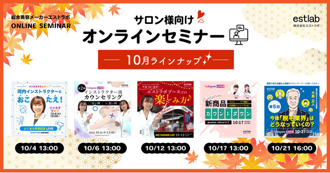 すべての人に「美」と「健康」の提供を目指し、化粧品や美容機器を製造する株式会社エストラボ(本社:東京都新宿区、代表取締役社長:久保瞳)は、定期開催しているエステサロン様向けの無料オンラインセミナーに関して、10月の開催情報を公開いたしましたので、ご案内申し上げます。