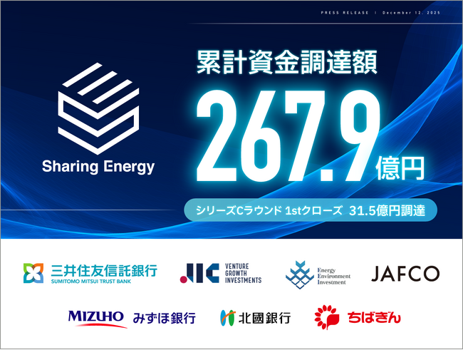 「分散電源の創出により、エネルギーシステムを変革する」をミッションに掲げ、太陽光の第三者所有サービス『シェアでんき』を提供する株式会社シェアリングエネルギー(本社:東京都港区、代表取締役:上村一行、以下、シェアリングエネルギー)は、シリーズC資金調達のファーストクローズにおいて、三井住友信託銀行株式会社、JICベンチャー・グロース・インベストメンツ株式会社、株式会社環境エネルギー投資、ジャフコ グループ株式会社(敬称略、順不同)を引き受け先とする第三者割当増資を実施いたしました。