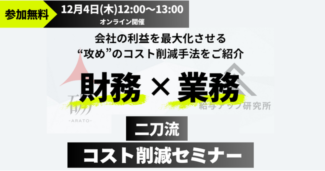 株式会社給与アップ研究所(本社:東京都千代田区、代表取締役:高橋恭介)は、財務コンサルティングを手がける株式会社砺(あらと)(本社:東京都千代田区、CEO:豊泉康一郎氏)と共同で、企業の「利益体質化」と「業務効率化」を同時に実現するオンラインセミナー『財務×労務【二刀流】コスト削減セミナー』 を2025年12月4日(木)に開催いたしました。