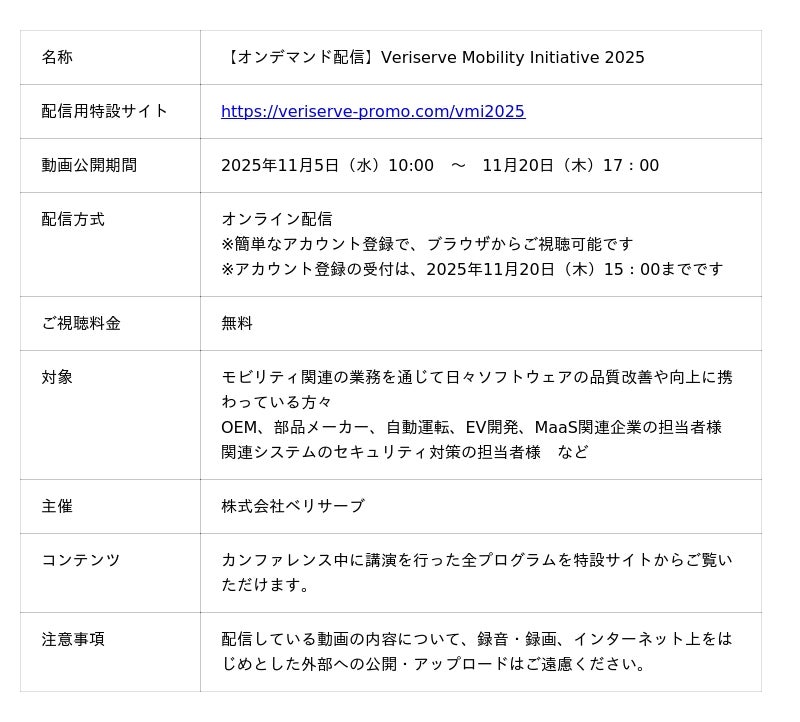 ソフトウェアの品質向上支援に関するサービスを提供する株式会社ベリサーブ(本社:東京都千代田区、代表取締役社長:新堀 義之、以下ベリサーブ)は、本日2025年11月5日(水)より、『SDVの未来を拓く-新たな体験価値を生み出す品質とは』をテーマに10月22日(水)と23日(木)に開催したモビリティ特化のオンラインカンファレンス『Veriserve Mobility Initiative 2025』の講演内容を、11月20日(木)までの期間限定で無料公開することをお知らせします。