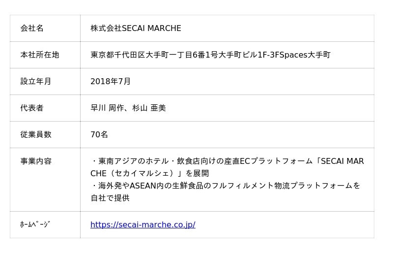 SECAI MARCHE社は2018年に日本で創業し、ASEAN域内のホテル・レストラン・カフェ等に向けて、生産者と消費者を直接つなぐ産直生鮮品ECプラットフォーム「SECAI MARCHE」を運営しています。同社は自社構築のコールドチェーン物流網を活用し、日本産および現地産の高品質な生鮮品を安定的に供給。生産者と利用者が持続的に成長できるサプライチェーンの構築を目指し、「創る人と使う人がダイレクトにつながり、情報と商品が公平に流通する世界を創造する」というミッションを掲げています。