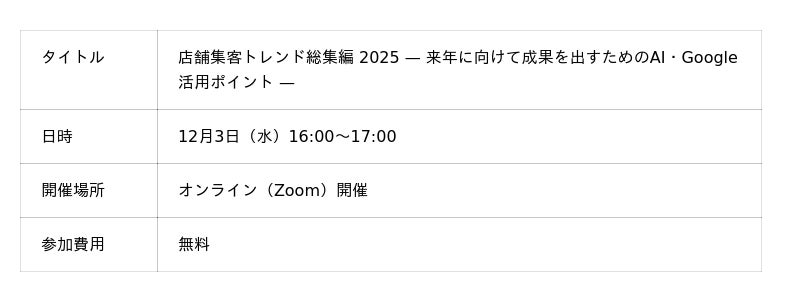 2025年12月3日(水)16:00より、『店舗集客トレンド総集編 2025 - 来年に向けて成果を出すためのAI・Google活用ポイント -』セミナー(無料)を開催いたします。