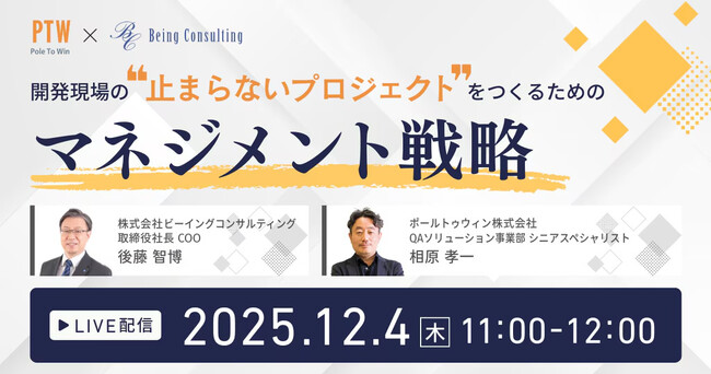 サービス・ライフサイクルにおける課題解決を支援するポールトゥウィン株式会社(本社:愛知県名古屋市、代表取締役CEO:橘 鉄平、代表取締役COO:志村 和昭、以下「ポールトゥウィン」)は2025年12月4日(木)にオンラインウェビナー「開発現場の“止まらないプロジェクト”をつくるためのマネジメント戦略」を開催いたします。